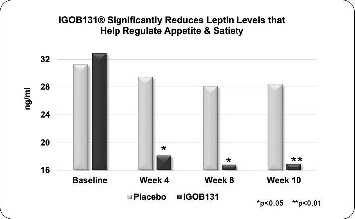 A randomized, double-blind, placebo controlled study involving 102 participants was conducted over 10 weeks to evaluate the effects of IGOB131 on body weight and associated metabolic parameters.